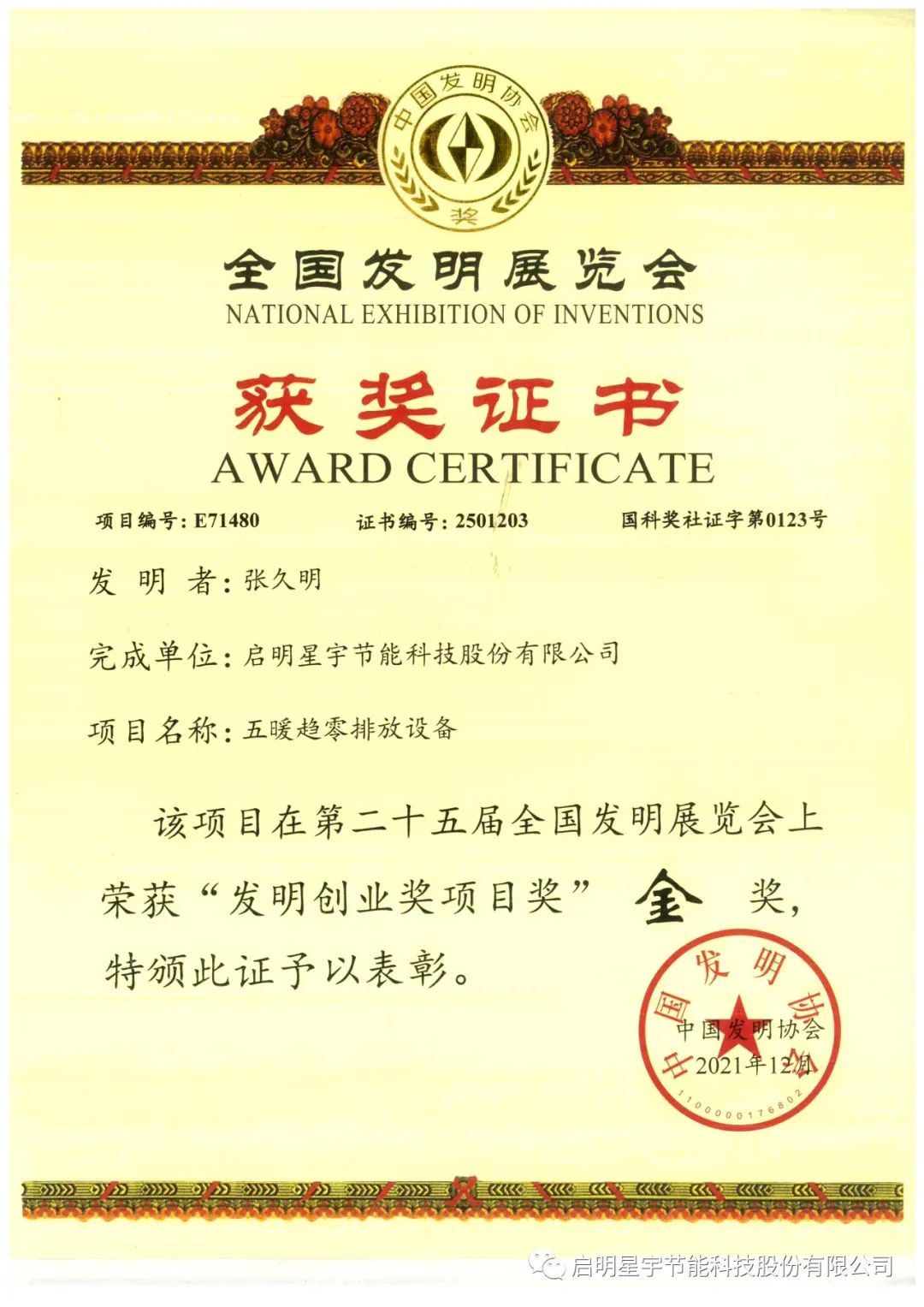 2017《趨零排放設備》獲得22屆中國發(fā)明金獎