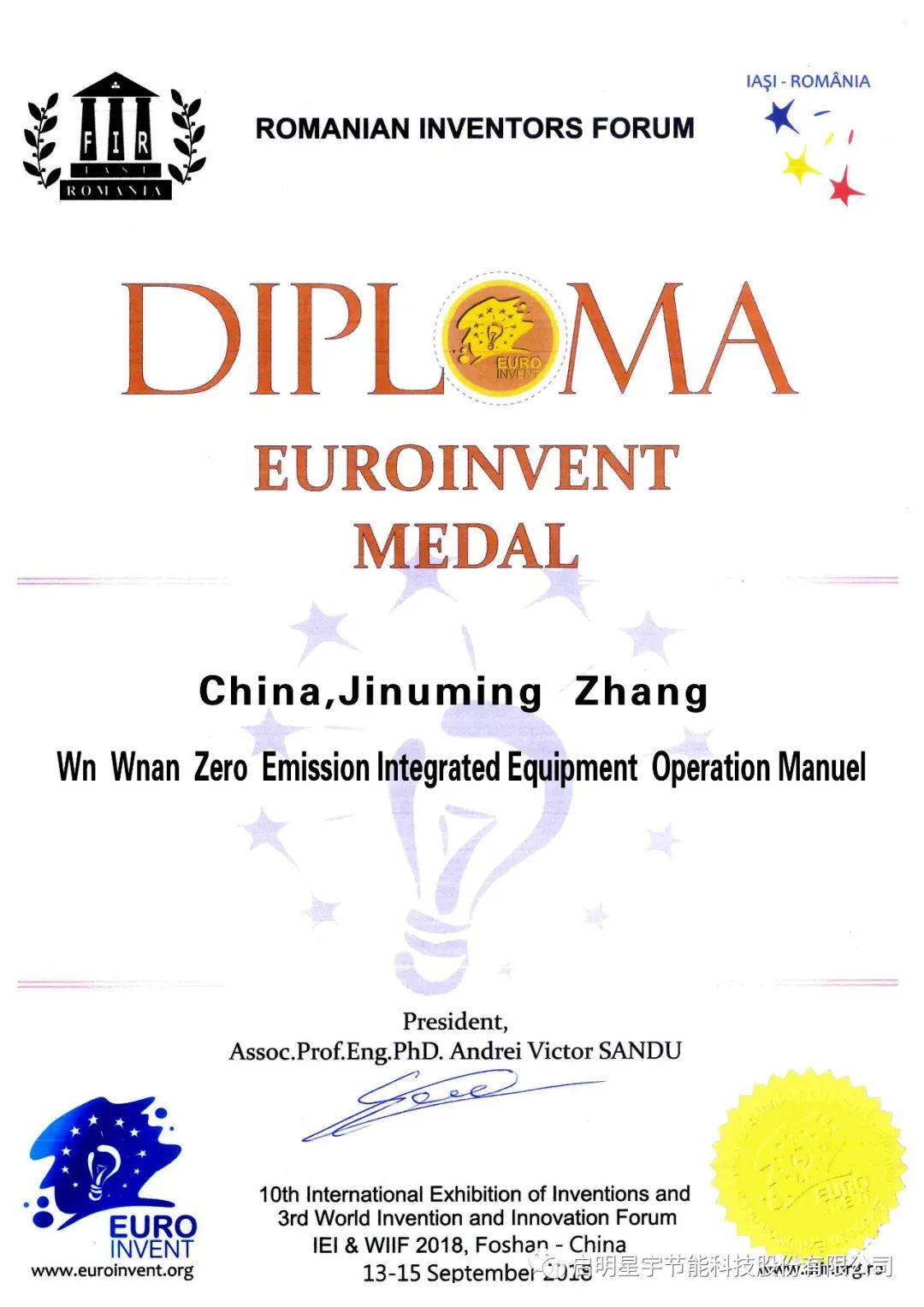 2018年9月參加第十屆國際發(fā)明博覽會,獲得發(fā)明創(chuàng)業(yè)獎,金獎、銀獎、銅獎;獲得歐洲發(fā)明協(xié)會環(huán)境治理發(fā)明金獎;獲得《發(fā)明之星》。